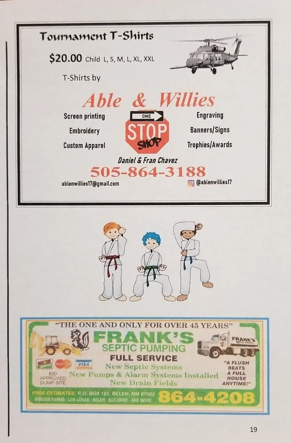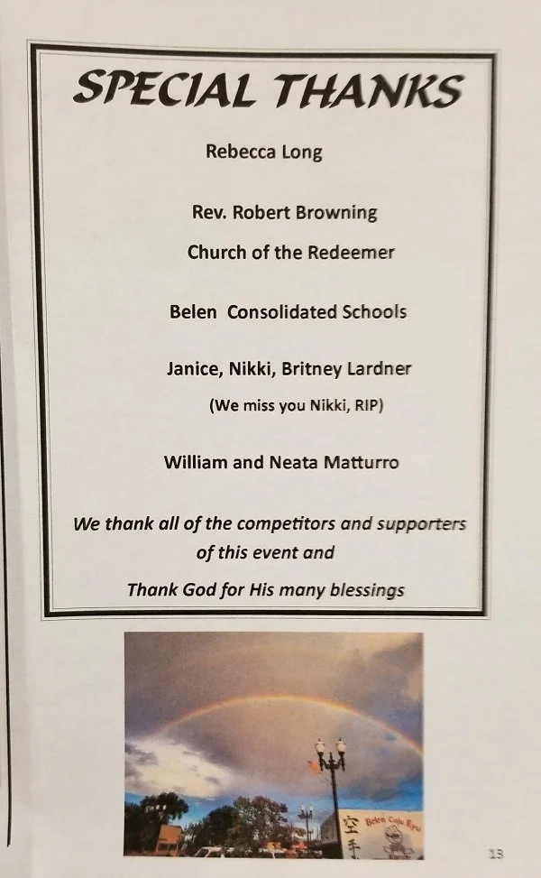 A Tournament Program is created for each tournament. 350 copies are distributed to all competitors, families, and spectators. The tournament rules are stated, trophies and awards are listed,and schedule of events. We also recognize those who help us make this a quality event with our opening prayer, Colors presented by, National Anthem performed by and all the businesses that sponsored this tournament. We encourage everyone to try and do business with our sponsors and thank them for their sponsorship. Not only does this help to make a positive event for everyone, this also helps us keep our Scholarship Program going to help others go to college in our daughter's name. How to apply for this Scholarship is on our Scholarship Info page.