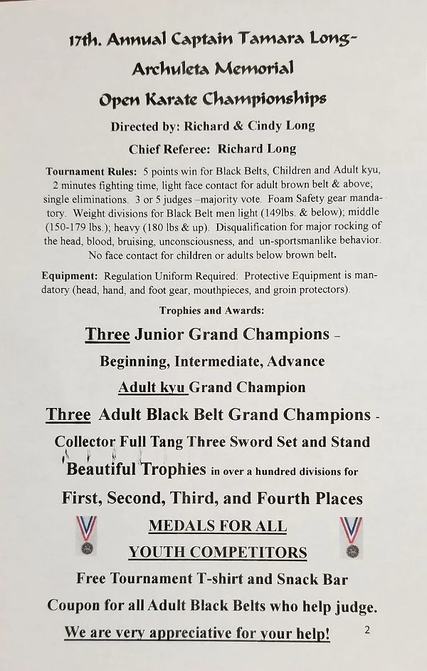 THE 17TH ANNUAL CAPTAIN TAMARA LONG ARCHULETA MEMORIAL OPEN KARATE CHAMPIONSHIPS